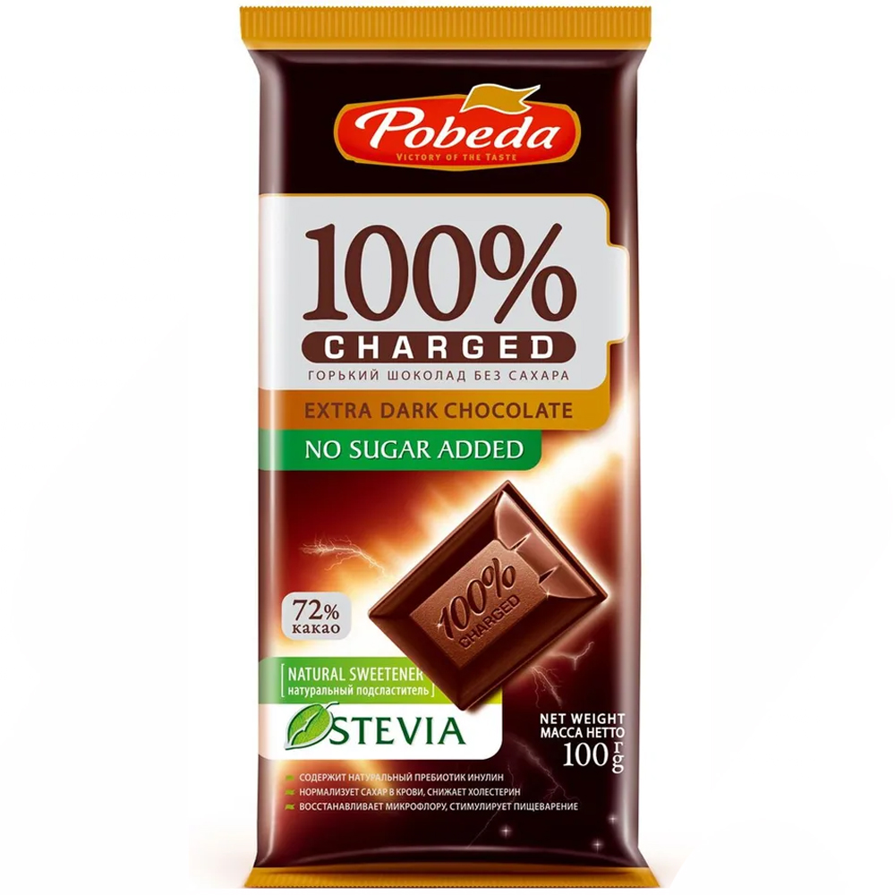 Pobeda is a Russian chocolate brand, founded in 1999, offering healthy and natural chocolate. The brand produces sugar-free chocolate made only from natural ingredients, and is especially known for its stevia-sweetened products. Pobeda is designed for people leading an active and healthy lifestyle.